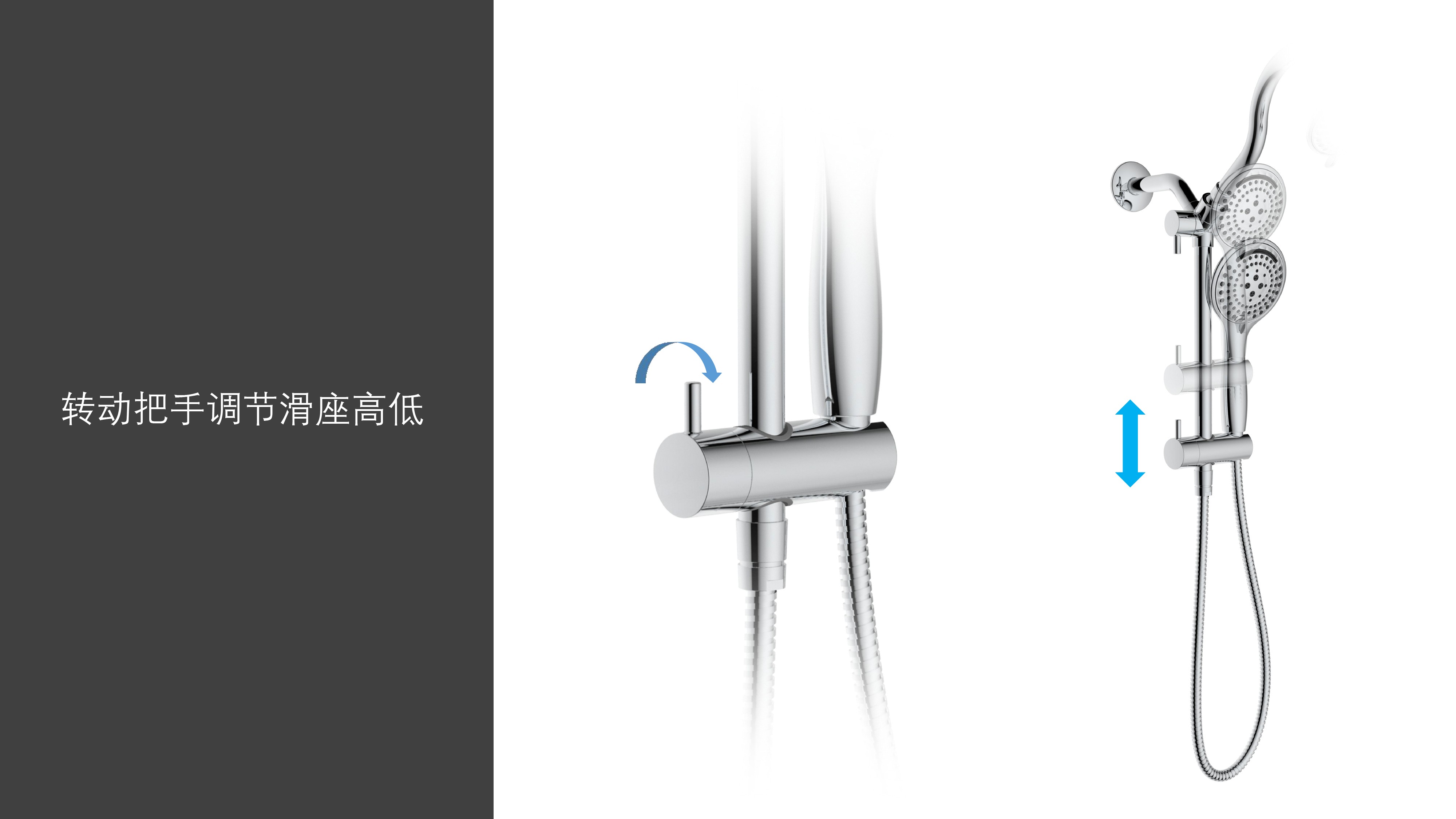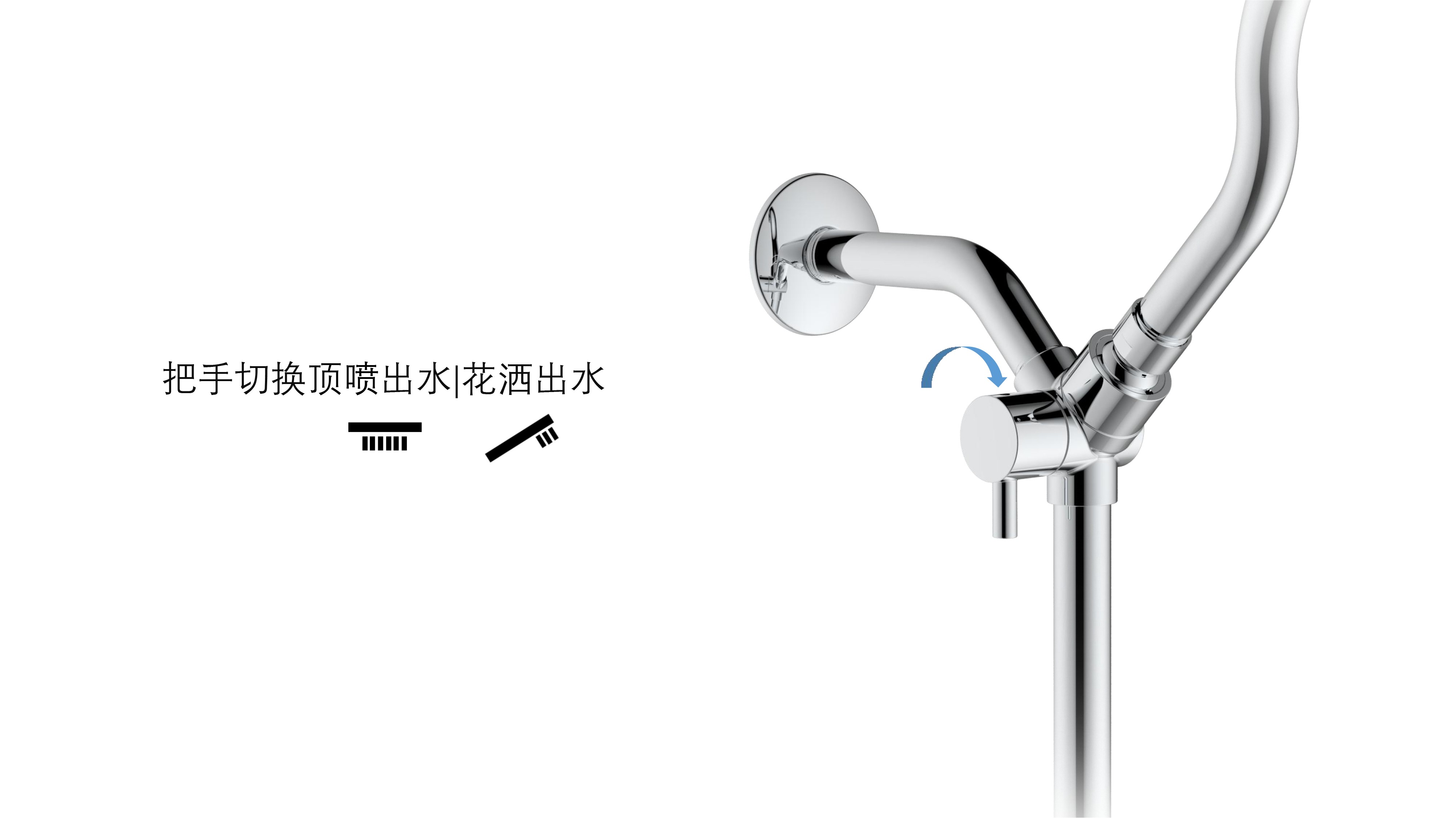 上出水彎管套裝;頂噴內置球頭,可實現多角度旋轉調整;把手切換頂噴出水、花灑出水;轉動把手調節(jié)滑座高低;帶瀑布水5功能花灑